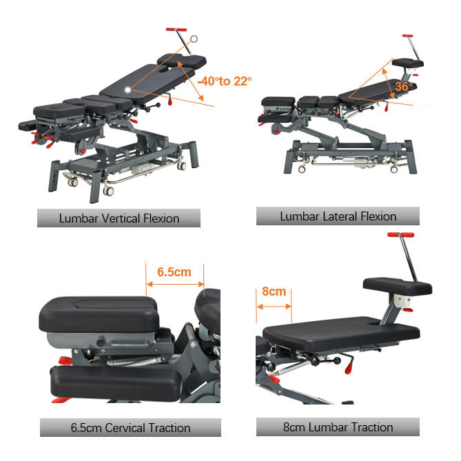 Manual Pelvic & Lumbar Flexion & Traction: Vertical –40°~+22°, Lateral: ±18°, plus manual traction for decompression