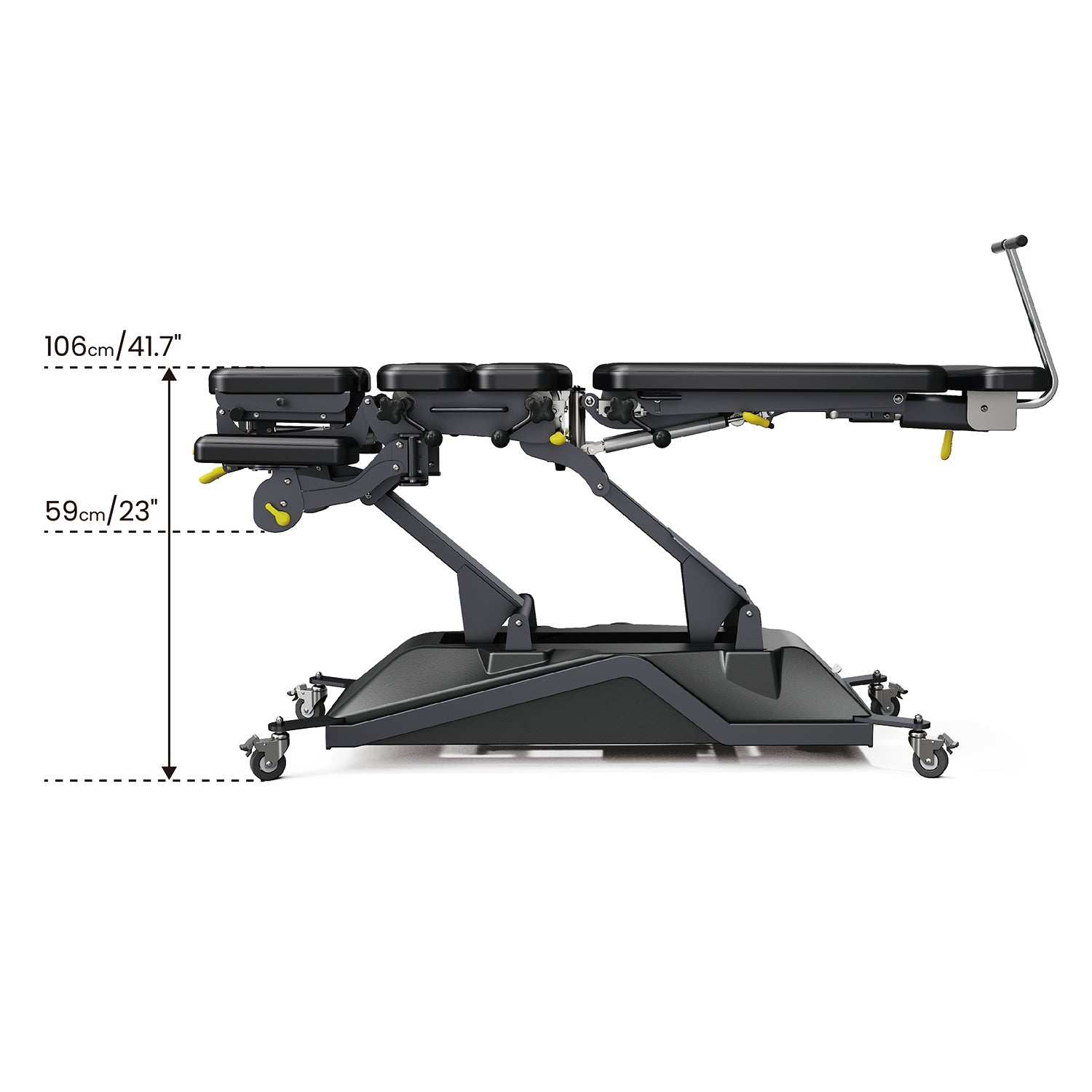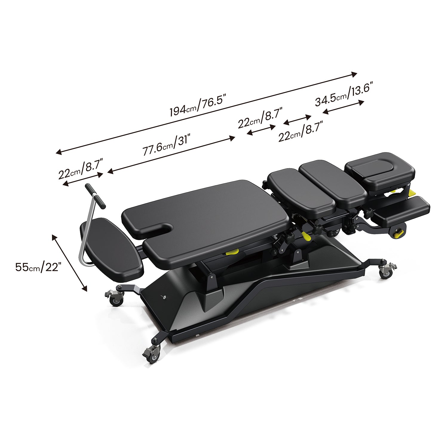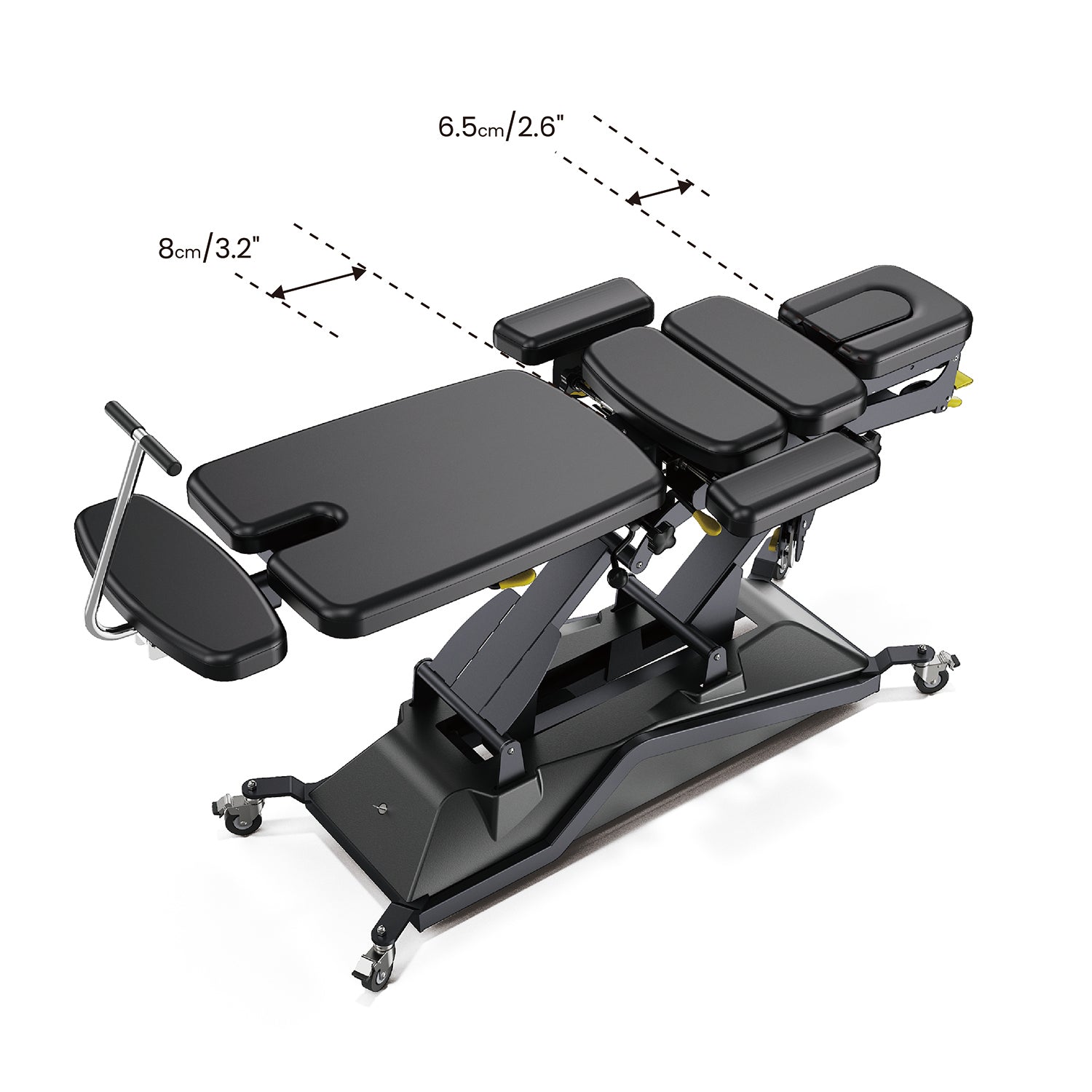 Height-Adjustable & Rotatable Armrests: The front armrests can be height-adjusted within a range of -20 ~0 cm / -7.87"~0 inch and rotated outward up to 180° to facilitate arm treatments